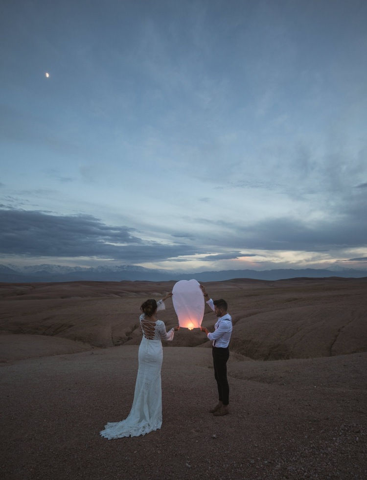 The experience of an elopement and private photoshoot in the Agafay Desert can be fully customized to match your vision. You can start with a camel ride into the desert at sunset, leading you to a beautifully arranged site where you’ll exchange vows surrounded by endless horizons. Afterward, indulge in a romantic dinner set up with Moroccan carpets, lanterns, and cushions, creating a cozy yet luxurious atmosphere. Capture these intimate moments with a professional photographer who knows the desert’s best spots, ensuring your memories are framed by the stunning desert backdrop. A fun and personal touch is releasing a sky lantern into the twilight sky, symbolizing your new journey together, as shown in the accompanying image, adding both a visual and emotional highlight to your desert adventure.